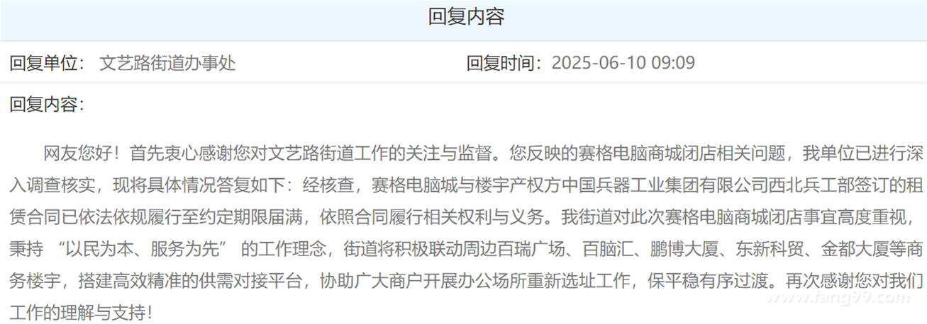 6月10日,西安市碑林区文艺路街道办事处回复:经核查,赛格电脑城与楼宇产权方中国兵器工业集团有限公司西北兵工部签订的租赁合同已依法依规履行至约定期限届满,依照合同履行相关权利与义务。我街道对此次赛格电脑商城闭店事宜高度重视,秉持