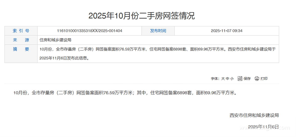 日前,西安市住建局发布了《2025年10月份二手房网签情况》,10月份,全市存量房(二手房)网签备案面积76.59万平方米;其中,住宅网签备案6898套,面积69.96万平方米。和9月相比,环比下降8.88%。仅高于2025年1月成交量,成为2025年以来的第二低谷。