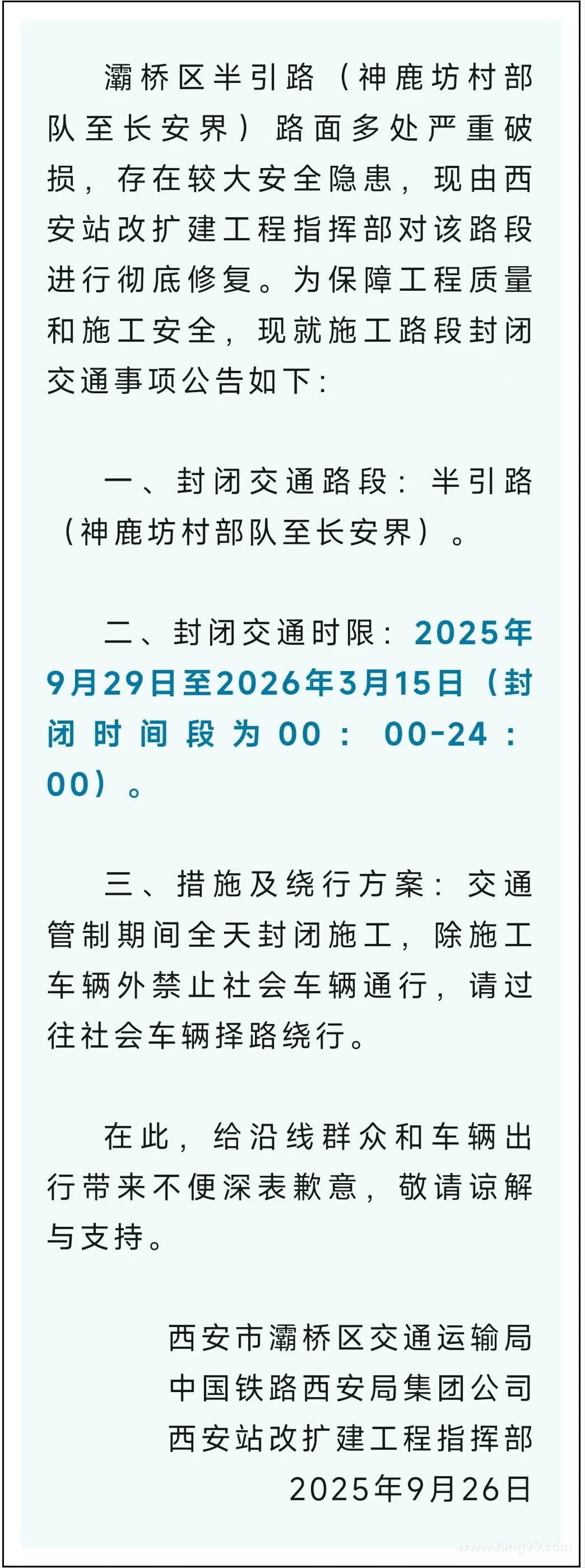 9月26日西安市灞桥区人民政府网站发布《关于灞桥区半引路(神鹿坊村部队至长安界)封闭交通的公告》,详情如下: